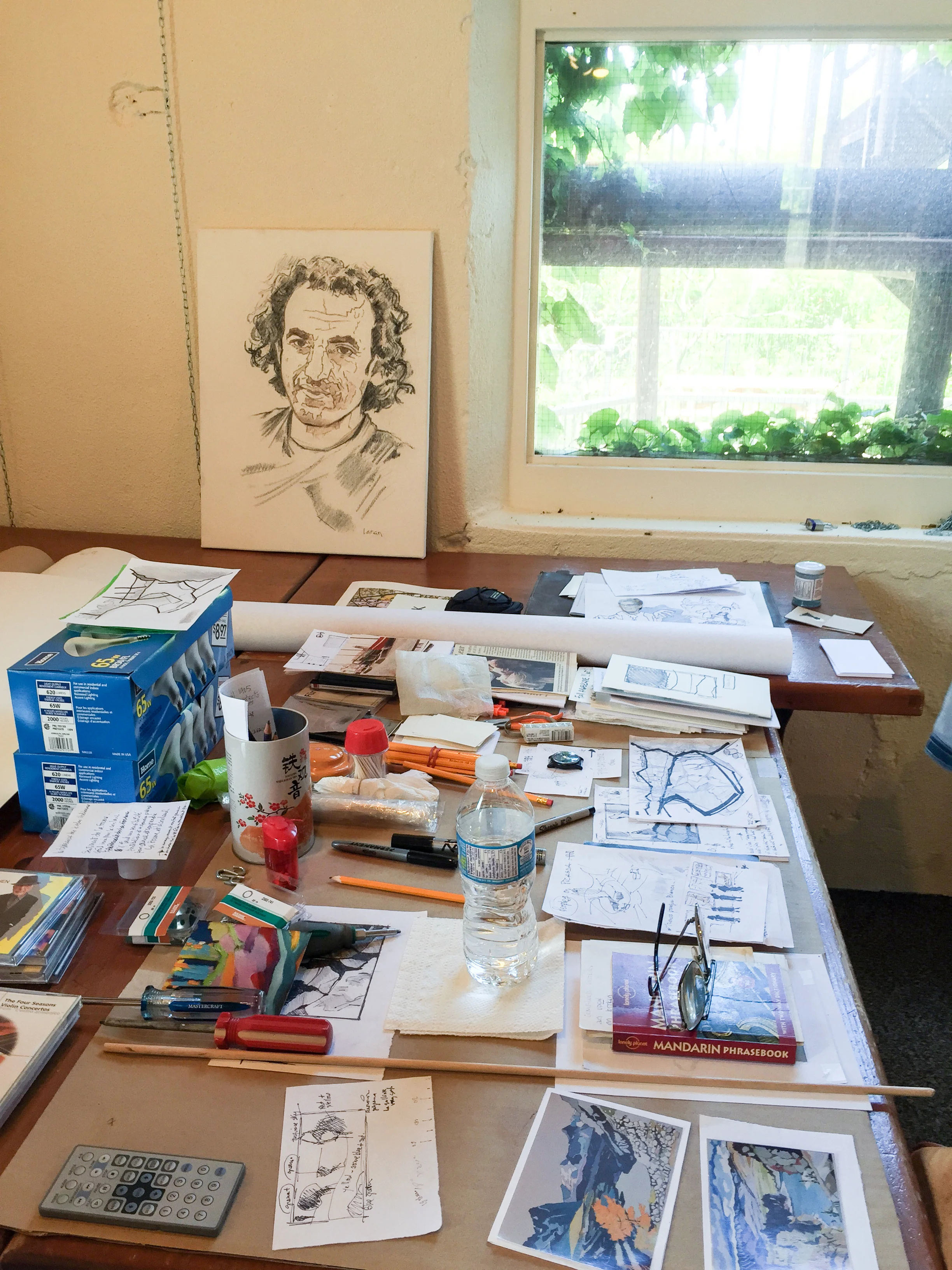 This photo is a little snapshot of his desk in the studio where Yves brainstorms and jots down ideas.